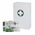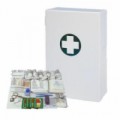 Nástěnná kovová lékárnička vhodná do skladů a obchodní prostor. Opatřená protiprachovým těsněním ve dvířkách. Vybavena dvěma policemi a dvěma přihrádkami ve dvířcích. Uzamykatelná lamelovým zámkem. Povrchová úpra bílým komaxitem.Kovová nástěnná lékárnička, uzamykatelná, 45 x 35 x 15 cm, s náplní SKLAD