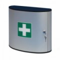 Hliníková lékárnička na stěnu vhodná do kancelářských, dílénských nebo průmysových prostorů. Vybavená dvěma otočnými přihrádkami a jednou plastovou kapsou. Uzamykatelná cylindrickým zámkem, dodávána se dvěma klíči. Povrchová úprava práškovým lakem.Kovová nástěnná lékárnička, uzamykatelná, 40 x 30,2 x 11,8 cm