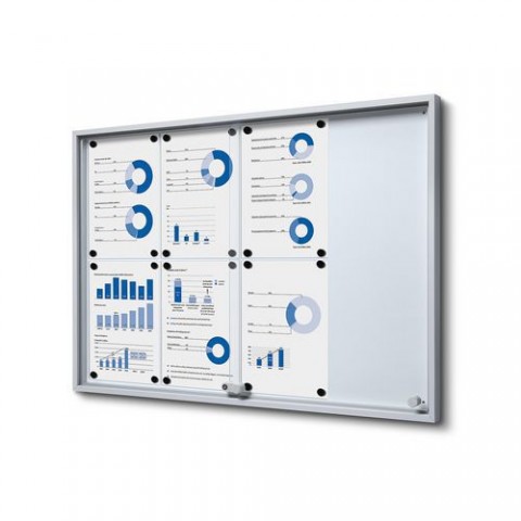 Magnetické vitríny s kovovým rámem ve stříbrné barvě vhodné do škol a kancelářských prostor. Lakovaná zadní stěna je popisovatelná. Díky tenkému profilu a posuvným dveřím příliš nezasahuje do prostoru. Tvrzené ESG sklo o šířce 4 mmMagnetické vitríny Slim