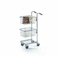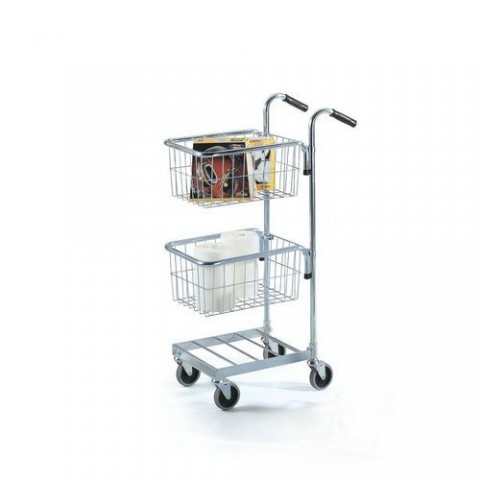 Kovový vozík s policí a dvěma košíky vhodný pro rozvoz balíků, pošty a zboží. Drátěné košíky o rozměrech 40,5 x 30 x 21 cm je možné upevnit do libovolné výšky, spodní police je pevná. Nosnost spodní police je 25 kg, košíky lze zatížit maximálně 10 kg. Mobilitu zajišťují čtyři otočná kola s kluznými ložisky. Běhoun kola je vyroben z nešpinivé gumy. Povrchová úprava pozinkováním. K vozíku je možné dokoupit držák na dokumenty formátu A4.Malý policový vozík se dvěma koši, do 35 kg