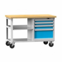 Mobilní dílenský stůl vybavený pevnou pracovní deskou z bukové spárovky. Ve spodní části stolu se nachází jedna výškově nastavitelná police a čtyři centrálně uzamykatelné zásuvky. Stůl je osazen dvěma pevnými a dvěma otočnými kolečky s brzdou z polypropylénu. Nosnost stolu je 380 kg. rozměry v x š x h: 80,5 x 120 x 70cm materiál: ocelový plech, tl. 0,8 mm rozměry pracovní desky v x š x h: 4 x 120 x 70 cm nosnost: 380 kg materiál pracovní desky: buková spárovka výška zásuvky: 2 x 7,5; 1 x 10; 1 x 25 cm nosnost zásuvek: 40 kg počet zásuvek: 3 ks výsuv zásuvek: 88 % počet polic: 1 ks nosnost polic: 50 kg průměr koleček: 125 mm brzděná kolečka: ano barva konstrukce: šedá RAL 7035 barva pracovní desky: buk barva zásuvek: modrá RAL 5012 barva skříňky: modrá RAL 5012 hmotnost: 100 kg uzamykatelnost - 2 klíče, povrchová úprava práškovým lakem, zkompletovánoMobilní dílenský stůl, 81 x 120 x 70 cm