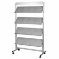 Pojízdné kovové stojany pro uložení prospektů a tiskovin. Konstrukci tvoří 4 kovové police s kapacitou až 16 x A4. Kolečka jsou opatřená aretací. Povrchová úprava práškovou barvou RAL 9006.Prezentační stojany Nice, 4 přihrádky