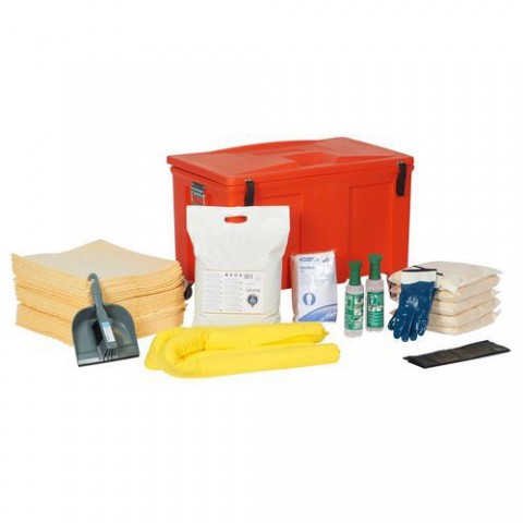 Pojízdný odolný kontejner (138 l) s gumovými koly obsahuje sadu chemických sorbentů s příslušenstvím pro rychlou likvidaci uniklých kapalin. Kontejner je vybaven nerezovými madly pro snadnou manipulaci. Čtyři otočná kolečka, z toho jedno s brzdou. Vhodný např. do laboratoří, chemických provozů či jiných prostředí kde se manipuluje s chemickými látkami.Mobilní havarijní souprava Ikasorb, chemická, sorpční kapacita 100 l