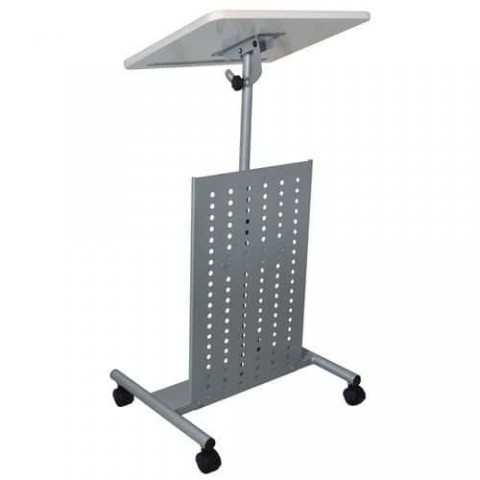 Mobilní řečnický pult. Výškově nastavitelná deska pultu. Horní deska v bílé barvě, přední panel a podstavec jsou ve stříbrné barvě. Je vybaven 4 kolečky s brzdou.Mobilní řečnický pult Desq, kovový, s čelním panelem