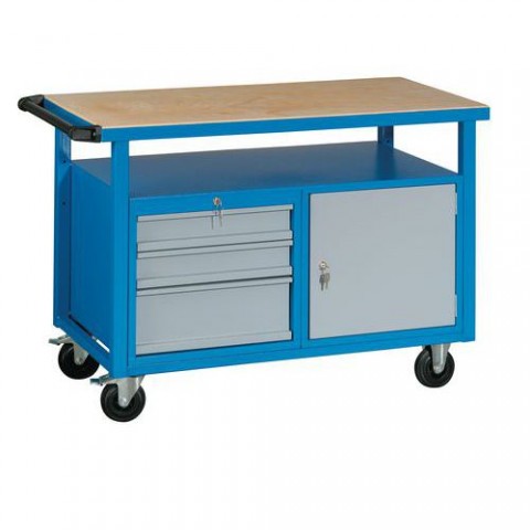 Mobilní pracovní stůl vhodný do dílen, pracoven i provozů. Robustní ocelová konstrukce svařovaná z jeklových profilů 40 x 40 mm. Pracovní deska stolu je vyrobena z lepeného smrkového dřeva, oboustranně dýhovaná bukovou překližkou. Stůl nabízí celkem tři police, z toho dvě jsou umístěny uvnitř uzamykatelné skříňky a jsou výškově nastavitelné. Tři zásuvky jsou centrálně uzamykatelné cylindrickým zámkem.Mobilní svařovaný dílenský stůl Rivt, 85 x 120 x 60 cm