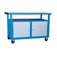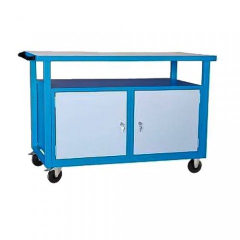 Mobilní pracovní stůl vhodný do dílen, pracoven i provozů. Robustní ocelová konstrukce svařovaná z jeklových profilů 40 x 40 mm. Pracovní deska stolu je vyrobena z lepeného smrkového dřeva, oboustranně dýhovaná bukovou překližkou. Stůl nabízí celkem pět polic, z toho čtyři jsou umístěny uvnitř uzamykatelných skříněk. Povrch je ošetřen polyesterovým vypalovaným práškovým lakem. Stůl je osazen čtyřmi otočnými kolečky o průměru O 125 mm. Dvě kolečka s brzdou, dvě bez brzdy. Plastová rukojeť pro snažší manipulaci.Mobilní svařovaný dílenský stůl Rivt, 85 x 120 x 60 cm