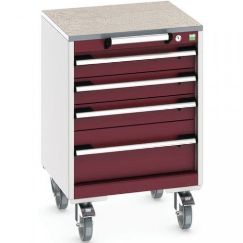 Mobilní zásuvkové skříně Bott Cubio s horní pracovní plochou tloušťky 2 cm typu multiplex/linoleum nebo ohraněný plech s rohoží. Nosnost až 300 kg, robustní svařovaná ocelová konstrukce, povrchová úprava práškovým lakem. Centrálně uzamykatelné zásuvky s výškou 3 x 10 a 1 x 20 cm, nosností 50 kg a 100% výsuvem na válečkových ložiskách. Ergonomické rukojeti zásuvek s popisovatelnou lištou, systém blokace otevření více zásuvek najednou. Dvě pevná a dvě otočná kola s brzdou o průměru 12,5 cm.Mobilní zásuvková skříň Bott Cubio, 79 x 52,5 x 52,5 cm, 4 zásuvky, multiplex/linoleum/rohož