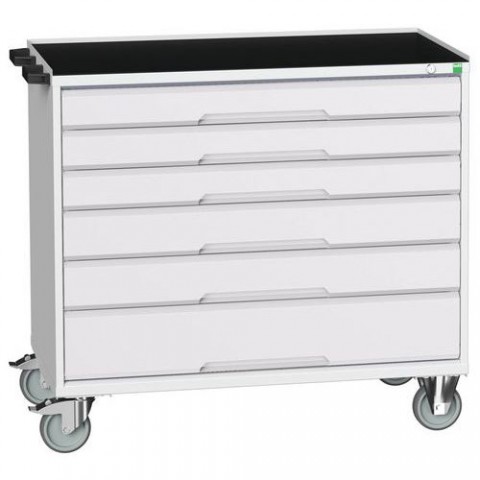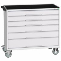 Mobilní pracovní stůl se zásuvkami Bott Verso s horní pracovní plochou tloušťky 3 cm typu multiplex/linoleum nebo ohraněný plech s rohoží. Nosnost až 200 kg, robustní svařovaná ocelová konstrukce, povrchová úprava práškovým lakem. Centrálně uzamykatelné zásuvky s výškou 2 x 7,5 cm, 3 x 10, 1 x 15 a 1 x 20 cm, nosností 50 kg a 100% výsuvem na válečkových ložiskách. Ergonomické rukojeti zásuvek s popisovatelnou lištou, systém blokace otevření více zásuvek najednou. Dvě pevná a dvě otočná kola s brzdou o průměru 12,5 cm, manipulaci usnadňují madla.Mobilní zásuvkové stoly Bott Verso, 98 x 80/105 x 55/60 cm, 6 zásuvek, multiplex/linoleum/rohož
