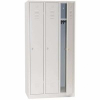 Montovaná kovová skříň se třemi oddíly do pracovní nebo školní šatny. Křídlové dveře jsou zavěšené na vnitřních pantech a lze je otevřít až o 115 °. Tiché dovírání díky plastovým dorazům. Možnost umístění jmenovky do štítku na dveřích. Kryté perforované otvory v horní části dveří zajišťují cirkulaci vzduchu. Odkládací polička ve vrchní části skříně, tyč se dvěma háčky pro zavěšení oděvů. Celokovová konstrukce z ocelového plechu tl. 0,6 mm. Skříň je umístěná na vyvýšeném soklu. Uzamykání pomocí cylindrického zámku (dodáváno se 2 klíči) nebo otočným uzávěrem v kombinaci s visacím zámkem (výška třměnu 40 mm, průměr tměnu 6 mm).Montované šatní skříně Manutan Expert IS, 3 oddíly