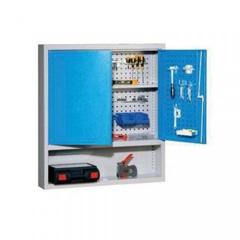 Nástavec vhodný pro umístění na stůl nebo zavěšení na stěnu vhodný pro přehledné uložení a jednoduchou dostupnost nářadí. Zadní stěna i vnitřní strana dvířek jsou perforovány pro připevnění držáků na nářadí. Otvory jsou čtvercového tvaru 10 x 10 mm s roztečí 38 mm. Skříňka je vybavena jednou výškově nastavitelnou policí a dalším úložnám prostorem pod skříňkou. rozměry v x š x h: 110 x 100 x 20 cm materiál: ocelový plech police stavitelné v rastru 25 mm, povrchová úprava práškovým lakem, možnost uzamčení (cylindrický zámek), zkompletovánoNástavec na nářadí, 110 x 100 x 20 cm