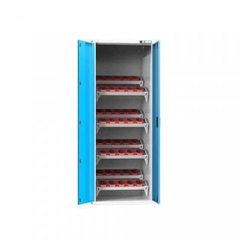 NC skříně jsou opatřeny dvojitými stěnami s perforací pro zavěšení polic, nosičů, nástrojových rámů a zásuvek. V případě vybavení skříne zásuvkami je standardně, z důvodu bezpečnosti (nebezpečí převrácení), dodávána blokace proti vysunutí více zásuvek. Korpus skříně se uzavírá křídlovými dveřmi s panty otočnými o 180°. Zamykání cylindrickým rozvorovým zámkem. Standardní výbavou je systém identifikace otvorů a popisový štítek s funkcí chytrý nábytek. Do skříní je možné zavěšovat zásuvky s půdorysem ZD (36x27).NC skříně s křídlovými dveřmi 36x27D s vybavením, var. 2