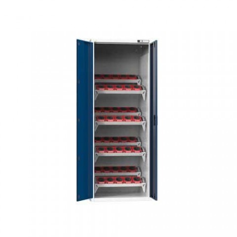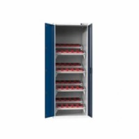NC skříně jsou opatřeny dvojitými stěnami s perforací pro zavěšení polic, nosičů, nástrojových rámů a zásuvek. V případě vybavení skříne zásuvkami je standardně, z důvodu bezpečnosti (nebezpečí převrácení), dodávána blokace proti vysunutí více zásuvek. Korpus skříně se uzavírá křídlovými dveřmi s panty otočnými o 180°. Zamykání cylindrickým rozvorovým zámkem. Standardní výbavou je systém identifikace otvorů a popisový štítek s funkcí chytrý nábytek. Do skříní je možné zavěšovat zásuvky s půdorysem ZD (36x27).NC skříně s křídlovými dveřmi 36x27D s vybavením, var. 4