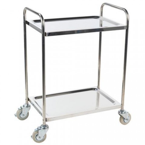 Policový vozík z nerezové oceli se dvěma policemi. Police jsou opatřeny vyvýšenou hranou, která zabraňuje vypadnutí převážených předmětů. Jednoduchá manipulace pomocí dvou kovových madel. Pohyb zajišťují čtyři otočná kola. Maximální nosnost police je 50 kg.Nerezový policový vozík Manutan Expert se dvěma madly, do 100 kg, 2 police s vyvýšenými hranami