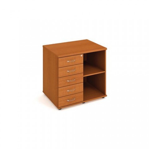 Skříň ve třech barevných variantách s výškově stavitelnou policí na pravé a zásuvkami na pravé straně. Vyrovnávací šrouby, osazení ABS hranami. dezén: buk, ořech, třešeň rozměry v x š x h: 75,5 x 80 x 60 cm materiál: laminovaná dřevotříska počet polic: 1 počet zásuvek: 5 nosnost police: 50 kg zámek: ano provedení: se zásuvkami - pravé provedení ABS hrany, desky tloušťky 18 mm (vrchní, spodní a boční desky) a 25 mm (police), vyrovnávací šrouby, dodáváno v demontovaném stavu (spojovací materiál součástí balení)Nízké široké skříně Strong, 75,5 x 80 x 60 cm, se zásuvkami - pravé provedení