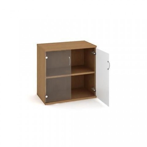 Nízká skříň ve třech barevných variantách se skleněnými dvířky a výškově stavitelnou policí. Osazení ABS hranami. dezén: buk, ořech, třešeň rozměry v x š x h: 76,8 x 80 x 40 cm materiál: laminovaná dřevotříska počet polic: 1 nosnost police: 80 kg provedení: se skleněnými dvířky ABS hrany (2 mm čelní strana, 1 mm ostatní hrany), desky tloušťky 18 mm (boky), 8 mm (zadní strana) a 25 mm (police, horní a spodní deska), dodáváno v demontovaném stavu (spojovací materiál součástí balení)Nízké široké skříně Strong, 76,8 x 80 x 40 cm, se skleněnými dvířky