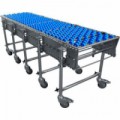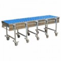 Nůžkový dopravník s plastovými rolnami je vhodný pro zhotovení přímých a zatáčkovitých tratí, spádových i rovinných. Sklon je možné seřídit pomocí výškově stavitelných noh. Bez nutnosti postranního vedení. nosnost: 70 kg (mezi 2 nohami) pracovní šířka: 500 mm celková šířka dopravníku: 620 mm délka dopravníku: 1 580 - 5 800 mm výška dopravníku: 665 - 1 000 mm počet os: 44 počet rolen na ose: 5 průměr rolen: 49 mm materiál rolen: nylon materiál konstrukce: pozinkovaná ocel ložiska: valivá (kuličková) počet noh: 4 barva: modrá brzděná kola, možnost tvarovat do zatáček až do 180°Nůžkový dopravník s plastovými rolnami, šířka 500 mm, 44 os