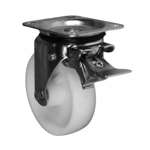 Otočná kola s brzdou a obručí z bílého nylonu. Kola jsou vybavena dvouřadým kuličkovým věncem ve vidlicové hlavě. typ kol: otočná s brzdou materiál kol: nylon průměr kola: 125 - 200 mm šířka kola: 45 mm nosnost: 400 kg způsob uchycení: vidlice s přírubou výška kola s vidlicí: 161 - 235 mm vyložení kola: 43 - 57 mm ložiska: kluzná povrchová úprava pozinkováním, dvouřadý kuličkový věnec ve vidlicové hlavě, teplotní odolnost -40 až +80 °C, odolné proti koroziNylonová transportní kola s přírubou, průměr 125 - 200 mm, otočná s brzdou, kluzná ložiska