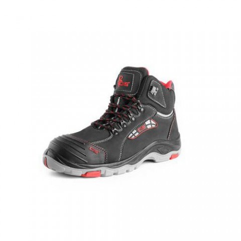 Kotníková obuv, kožená. Velikost: 37 - 48 Typ obuvi: Kotníková Stupeň ochrany: S3 Normy: EN ISO 20345:2011 S3 SRC HRO Materiálové složení: nubuková kůže, polyuretan Barva: černo-červenáObuv kotníková, ROCK DIORIT S3, černá, s ocel.špičkou a planžetou