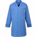 Antistatický pracovní oděv pro ESD pracovní prostředí. Bezpečný oděv skrytá přední část dvě spodní kapsy jedna kapsa na hrudi a nastavitelné manžety. CE certifikace ESD Kapsa na mobilní telefon UPF 50+ Nastavitelné manžety na suchý zip 3 kapsyESD antistatický plášť, modrá