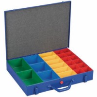 Organizér z lakované oceli pro uložení drobného materiálu. Přihrádky v různých barvách a velikostech. Víko je vyplněné pěnou pro lepší těsnění. Box je opatřen rukojetí, klipsy a zajišťovacím mechanismem.Organizér Pro Metal, 23 přihrádek