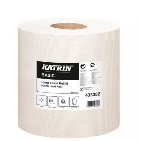 Papírové ručníky v roli. Prodej po balení. počet vrstev: 1 návin: 300 m průměr: 20 cm šířka: 18 cm materiál: čerstvé vlákno barva: šedá balení: 6 ksPapírové ručníky Katrin Basic M 1vrstvé, 300 m, šedé, 6 ks