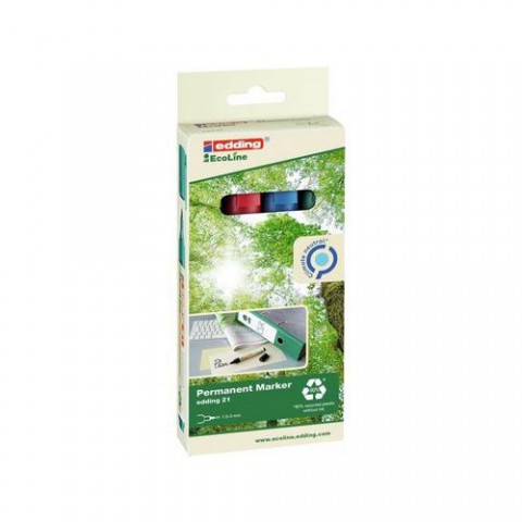 Balení barevných permanentních průmyslových popisovačů s kulatým hrotem. Fixy jsou vhodné na kovy, plasty, karton, dřevo a sklo. Stopa je voděodolná, světlo stálá, odolná proti rozmazání a otěru, šířka hrotu 1,5 - 3 mm. Rychleschnoucí, s nízkým zápachem a bez přidaného toluenu a xylenu. Možnost dokoupení náhradních hrotů a inkoustu prodlužuje celkovou životnost popisovačů.Permanentní popisovače edding EcoLine 21, balení 4 barev