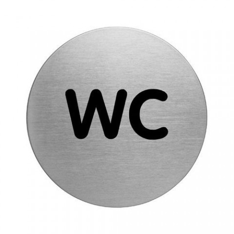 Označení toalety. Vyrobeno z kartáčované oceli s potiskem odolným proti poškrábání. Uchycení oboustrannými samolepkami.Piktogram WC