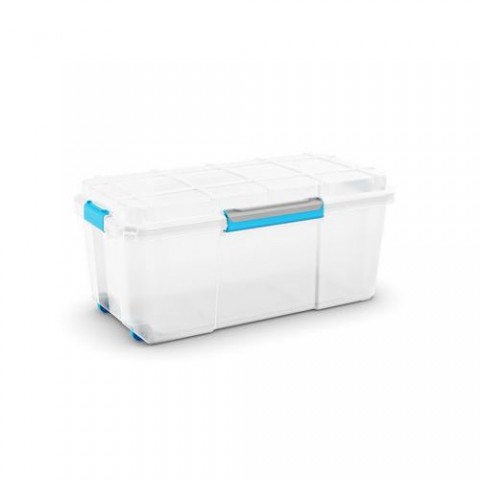 Plastové ukládací bedny s multifunkčním využitím. Boxy jsou odolné vůči vlhkosti díky hermeticky uzavíratelnému víku. Transparentní materiál umožňuje přehled o uložených věcech bez nutnosti otevření. Boxy jsou stohovatelné a klipy zaručují jejich pevné uzavření.Plastové úložné boxy s víkem na klip, průhledné