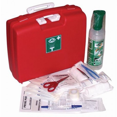 Plastový kufřík obsahuje veškerý zdravotnický materiál pro poskytnutí první pomoci při zasažení očí nebezpečnou látkou nebo při podráždění cizím předmětem. Jedna láhev fyziologického roztoku vystačí na cca 4 minuty intenzivního vyplachování. Kufr lze jednoduše vyjmout ze stěnového držáku a přenést přímo na místo úrazu. Upevňovací materiál je součástí dodávky.Plastový kufr se sadou pro výplach oči a se stěnovým držákem, 28 x 32 x 11,9 cm