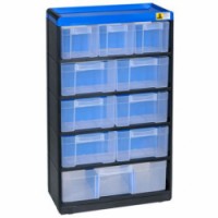 Plastové organizéry se zásuvkami řady VarioPlus Pro se vyznačují velmi robustním provedením. Vysoká stabilita díky přihrádkám z plastových profilů. Vysoká nosnost díky ocelovému obložení spodní části přihrádek. Zásuvky jsou zajištěny proti vypadnutí. Možnost čtyřbodové montáže na stěnu. Vhodné pro profesionální použití (např. pro skladování součástek a jiných dílů). Horní část organizéru vhodná např. pro odkládání nářadí. Dodáváno včetně děličů do zásuvek.Plastový organizér VarioPlus Pro 53/21, 10 zásuvek