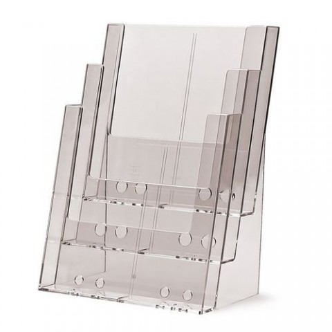 Plexi stojánek na letáky, brožury, propagační materiály apod. Tři kapsy ve stupních za sebou orientované na výšku. Možnost rozdělení kapes děličem na kapsy formátu A6. Stojánek je standardně dodáván bez potisku.Plexi zásobník na letáky JD18, 3 kapsy na výšku, A4