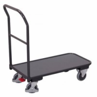 Ocelový plošinový vozík s pevným madlem. Ložná plocha z bukové MDF desky. Nakládací výška 220 mm. Šedá kola z termoplastické pryže nezanechávající stopy na plastovém ráfku s přesnými kuličkovými ložisky. Dvě pevná a dvě otočná kola s brzdou EasySTOP.Plošinové vozíky s madlem, do 200 kg
