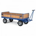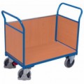 Manipulační vozík s pevnou ocelovou konstrukcí a vysokou nosností. Ložná plocha a bočnice jsou vyrobeny z laminované dřevotřísky. Boční stěny vysoké 25 cm jsou sklopné nebo demontovatelné, čelní stěny vysoké 37 cm jsou pevné. Pohyb zajišťují čtyři kola s valivými jehlovými ložisky, z nichž dvě jsou pevná a dvě otočná. Kola jsou široká 85 mm a jsou vybavena ochrannými kryty. Zvednutím táhla dojde k zabrzdění předních otočných kol. Povrchová úprava práškovým lakem.Ruční plošinový vůz se čtyřmi stěnami s plnou výplní, do 1 500 kg