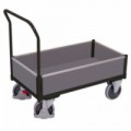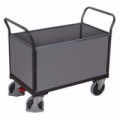 Manipulační vozíky s vysokou nosností, pevnou ocelovou konstrukcí a čtyřmi stěnami včetně dvou madel. Stěny a ložná plocha jsou vyrobeny z voděodolné překližky v černé barvě. Pohyb zajišťují čtyři kola s valivými kuličkovými ložisky, z nichž dvě jsou pevná a dvě otočná s brzdou Easy Stop.Plošinové vozíky se dvěma madly s plnou výplní a bočními stěnami, do 1 000 kg