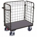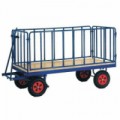 Manipulační vozík s pevnou ocelovou konstrukcí, velkou ložnou plochou a čtyřmi mřížovými stěnami. Ložná plocha je vyrobena z laminované dřevotřísky. Stěny jsou vysoké 77 cm, boční lze odejmout, čelní stěny jsou pevné. Pohyb zajišťují čtyři dušová kola s valivými jehlovými ložisky, z nichž dvě jsou pevná a dvě otočná. Kola jsou široká 85 mm a jsou vybavena ochrannými kryty. Zvednutím táhla dojde k zabrzdění předních otočných kol. Povrchová úprava práškovým lakem.Ruční plošinový vůz se čtyřmi stěnami s mřížovou výplní, do 600 kg