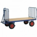 Manipulační vozík s pevnou ocelovou konstrukcí, velkou ložnou plochou a dvěma mřížovými stěnami. Stěny z ocelových trubek jsou vysoké 72 cm a lze je jednoduše našroubovat. Ložná plocha je vyrobena z laminované dřevotřísky. Pohyb zajišťují čtyři dušová kola s valivými jehlovými ložisky, z nichž dvě jsou pevná a dvě otočná. Kola jsou široká 85 mm a jsou vybavena ochrannými kryty. Zvednutím táhla dojde k zabrzdění předních otočných kol. Povrchová úprava práškovým lakem. Vozíky lze dodat i v atypickém provedení nebo jiné barvě.Ruční plošinový vůz se dvěma stěnami s mřížovou výplní, do 600 kg