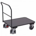 Ocelový plošinový vozík s pevným madlem. Ložná plocha z bukové MDF desky. Nakládací výška 220 mm. Šedá kola z termoplastické pryže nezanechávající stopy na plastovém ráfku s přesnými kuličkovými ložisky. Dvě pevná a dvě otočná kola s brzdou EasySTOP.Plošinové vozíky s madlem, do 200 kg