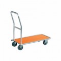 Manipulační vozík s pevnou ocelovou konstrukcí a madlem. Ložná plocha je vyrobena z laminované dřevotřísky v odstínu buk. Pohyb zajišťují čtyři kola s valivými jehlovými ložisky, z nichž dvě jsou pevná a dvě otočná. Kola jsou vybavena poklicemi, které brání namotávání nití, provázků a zanášení ložiska jinými nečistotami. Povrchová úprava práškovým lakem.Plošinový vozík s madlem, do 200 kg
