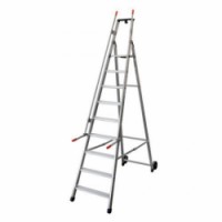 Mobilní schůdky s devíti stupni a plastovým držákem na nářadí. Bezpečnostní zábradlí podél schůdků s plastovými koncovkami. Lehkou manipulaci zajišťují dvě kolečka a madla. Příčky mají šíři 10 cm, což umožňuje pohodlný a bezpečný došlap.Pojízdné hliníkové schůdky Facal s držákem, 9 stupňů