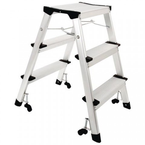 Oboustranné skládací schůdky s plošinou. Díky lehké hliníkové konstrukci jsou snadno skladovatelné. Transport zajišťují 4 kolečka (průměr 30 mm), která se při zatížení zabrzdí a zamezí tak dalšímu pohybu a nebezpečí pádu. Povrchová úprava eloxováním, součástí jsou ochranné patky. Schůdky splňují normu ISO 9001.Pojízdné hliníkové schůdky s plošinou Manutan Expert, oboustranné, 2 x 3 stupně