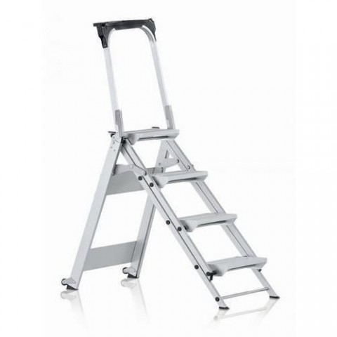 Skládací hliníkové schůdky se třemi stupni, vhodné pro sklady, kanceláře nebo obchody. Vybavené praktickou odkládací poličkou na madle. Stupně o rozměrech 36 x 20,5 cm, vzdálenost mezi stupni je 22 cm. Schůdky jsou opatřené dvěma kolečky a ochrannými patkami.Pojízdné hliníkové schůdky Zarges s plošinou, 3 stupně