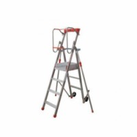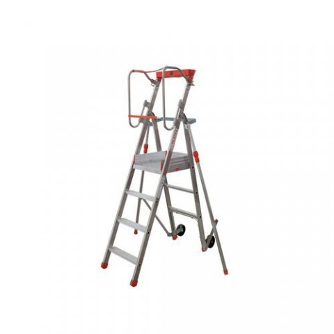 Hliníkové pracovní schůdky se čtyřmi stupni a pracovní plošinou. Pracovní plošina má rozměr 40,5 x 51 cm, je perforovaná a vybavená ochranou proti sklouznuti nohy. Bezpečnostní zábradlí s plastovým držákem na nářadí a s popruhy pro zabezpečení osoby. Schůdky jsou skládatelné a lze je jednoduše přemístit pomocí dvou pojezdových koleček o průměru 150 mm. Stabilitu při rozložení zajišťují kovové stojiny. Příčky mají protiskluzový povrch a šíři 85 mm. Schůdky jsou opatřené plastovými patkami.Pojízdný hliníkový plošinový žebřík Facal s držákem, 4 stupně
