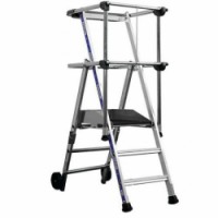 Mobilní skládací plošinový žebřík se třemi stupni. Vysoce stabilní pracovní plošina, která je vybavená bezpečnostním zábradlím a bočními lištami, které zabraňují vypadnutí předmětů. Rychlá příprava do pracovního režimu, snadná manipulace díky dvěma kolům. Součástí je odkládací polička na nářadí.Pojízdný skládací hliníkový plošinový žebřík s odkládací plochou, 3 stupně