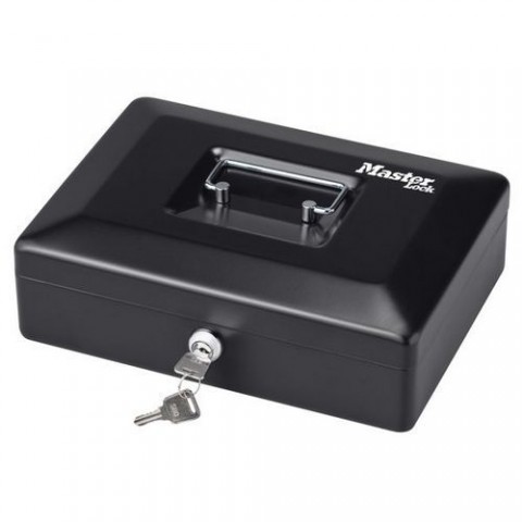 Uzamykatelný pokladní box pro uložení hotovosti. Pevná ocelová konstrukce. Vyjímatelný tác se 6 přihrádkami pro mince. Praktické držadlo.Pokladní uzamykatelný box Master Lock