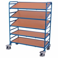 Dlouhý vozík s pěti policemi z bukových MDF desek, 15mm okraj. Naklonění horních polic o 17° nebo 32°, nosnost 50 kg na polici. Vzdálenost mezi příčnými trubkami 125 mm. Rozteč otvorů pro přišroubování polic 150 mm. 4 otočná kola, z nichž dvě jsou opatřená brzdou. Šedá kola z termoplastické pryže nezanechávající stopy na plastovém ráfku s přesnými kuličkovými ložisky.Policové vozíky Euro se šikmými policemi, 5 polic, 135 x 66,5 x 170 cm