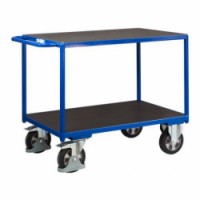 Policové vozíky s vysokou nosností a dvěma policemi vhodné do skladů pro přepravu těžkých břemen. Police jsou vyrobené z voděodolné protiskluzové překližky. Pojízdnost zajišťují čtyři kola s valivými kuličkovými ložisky, z nichž dvě jsou pevná a dvě otočná s brzdou Easy Stop a ochrannými kryty.Policové vozíky s madlem, do 1 000 kg, 2 police
