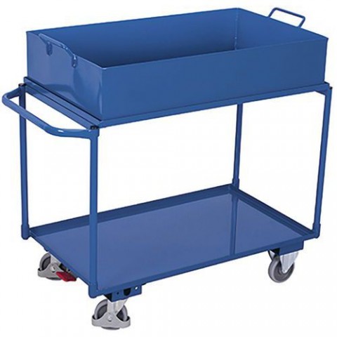 Vozík s madlem a ocelovými policemi s vyvýšenou hranou 25 mm. Vyjímatelná ocelová vana se dvěma madly o objemu 113 l, výška 200 mm. 2 pevná a 2 otočná kola s brzdou EasySTOP. Šedá kola z termoplastické pryže nezanechávající stopy na plastovém ráfku s přesnými kuličkovými ložisky.Policové vozíky s vanou, 2 kovové police s vyvýšenou hranou, do 250 kg, 117 x 61 x 84,5 cm