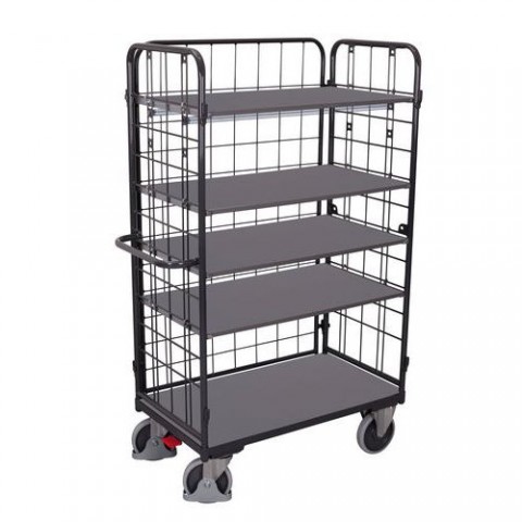 Policový vozík se třemi odnímatelnými mřížovými stěnami s oky o rozměru 120 x 120 mm. Police vyrobené z MDF desek lze variabilně sestavit v krocích 120 mm. 2 pevná a 2 otočná kola s brzdou EasySTOP. Šedá kola z termoplastické pryže nezanechávající stopy na plastovém ráfku s přesnými kuličkovými ložisky.Policové vozíky se 3 mřížovými stěnami, 5 polic, do 400 - 500 kg