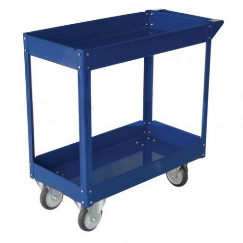Ocelový vozík se šroubovou konstrukcí a dvěma policemi vhodný do dílen, skladů nebo kanceláří. Police tvoří ocelový plech s vysokou hranou, která zabraňuje vypadávání věcí z vozíku. Pojízdnost zajišťují čtyři kola s valivými kuličkovými ložisky, z nichž dvě jsou pevná a dvě otočná. Povrchová úprava práškovým lakem.Policový vozík s madlem, do 100 kg, 2 police s vyvýšenými hranami