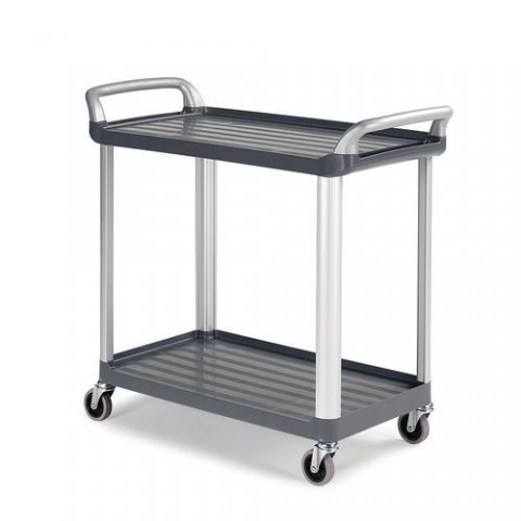 Plastový policový vozík se dvěma policemi pro všestranné využití. Police s protiskluzovým povrchem jsou vyrobené z polypropylenu a opatřené vyvýšenou 24mm hranou, která zabraňuje vypadávání předmětů z vozíku. Mobilitu zajišťují čtyři otočná kola s valivými kuličkovými ložisky.Policový vozík TTS se dvěma madly, do 150 kg, 2 police s vyvýšenými hranami